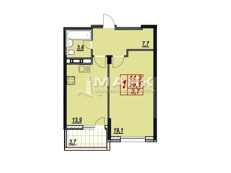Коридор 7,7 кв.м, санузел 3,6 кв.м, комната 19,1 кв.м, кухня 13,9 кв.м. с выходом на застекленную лоджию 3,7 кв.м.