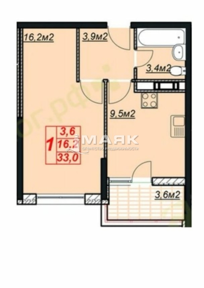Кухня объединена с лоджи 13 кв.м, комната 16.2 кв.м, коридор 3.9 кв.м, санузел 3.4 кв.м.