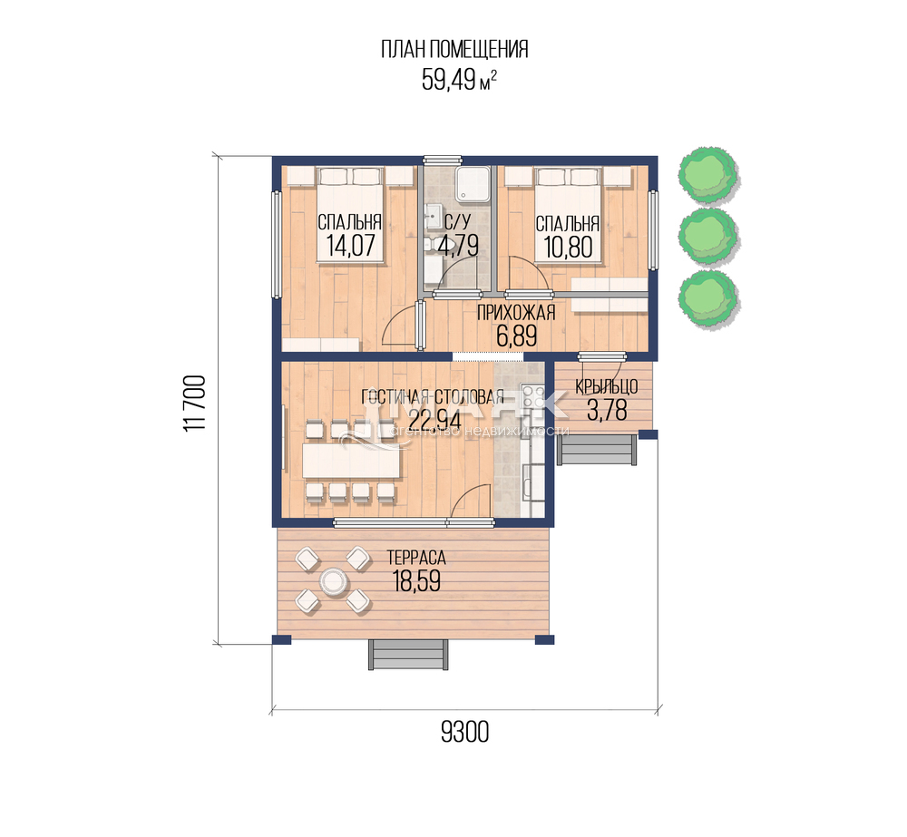 - кухня-гостиная, 2 спальни, прихожая, и замечательная терраса. Выход на неё