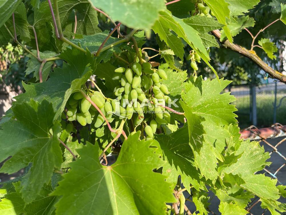 Ухоженный огород и сад с плодоносящими деревьями. Насаждения винограда.