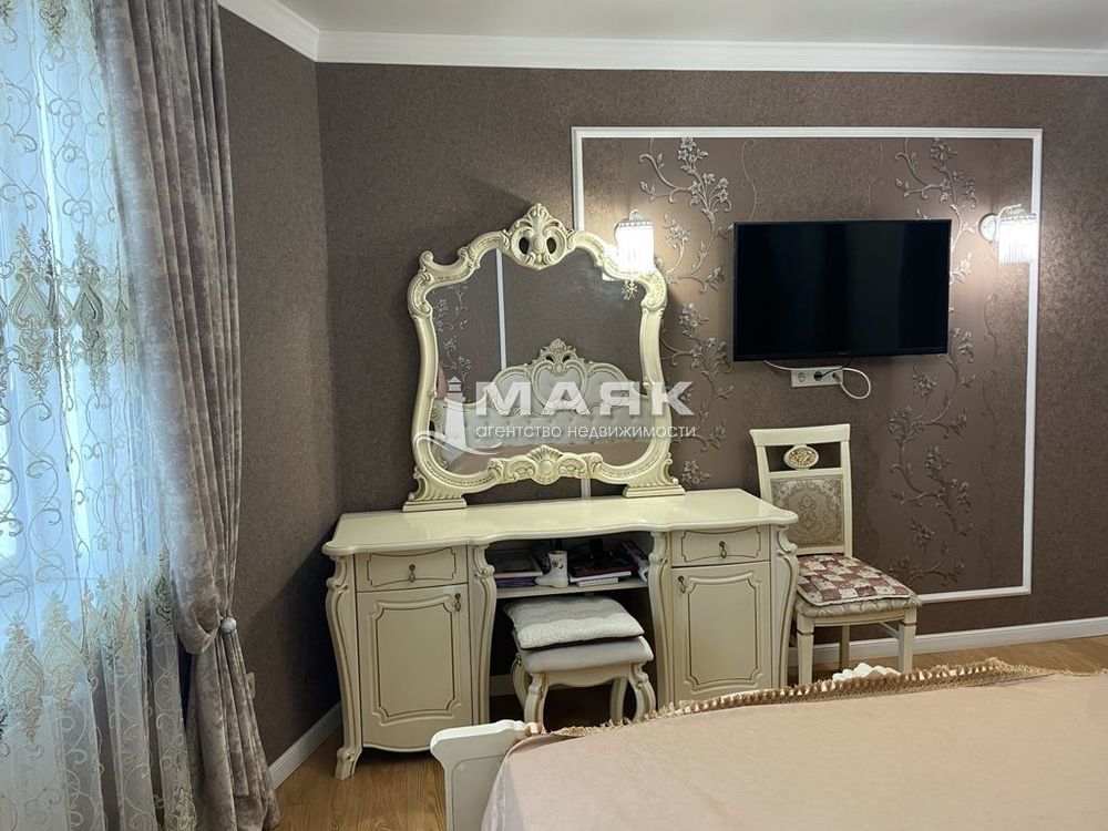 В спальне: двуспальная кровать, телевизор, интернет, шкаф с зеркалом, стол косметический с зеркалом.