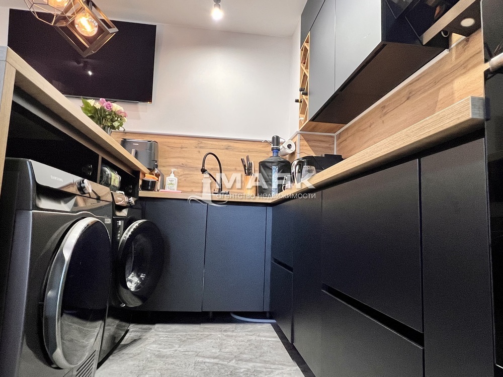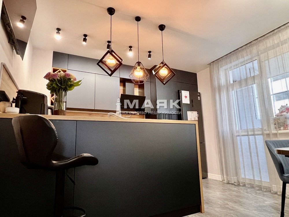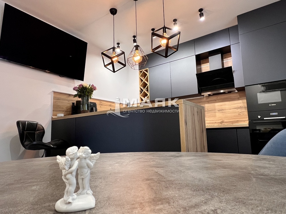 - На кухне установлен стильный кухонный гарнитур, разделенный барным столом на зону приготовления и отдыха, что делает процесс готовки еще более приятным.